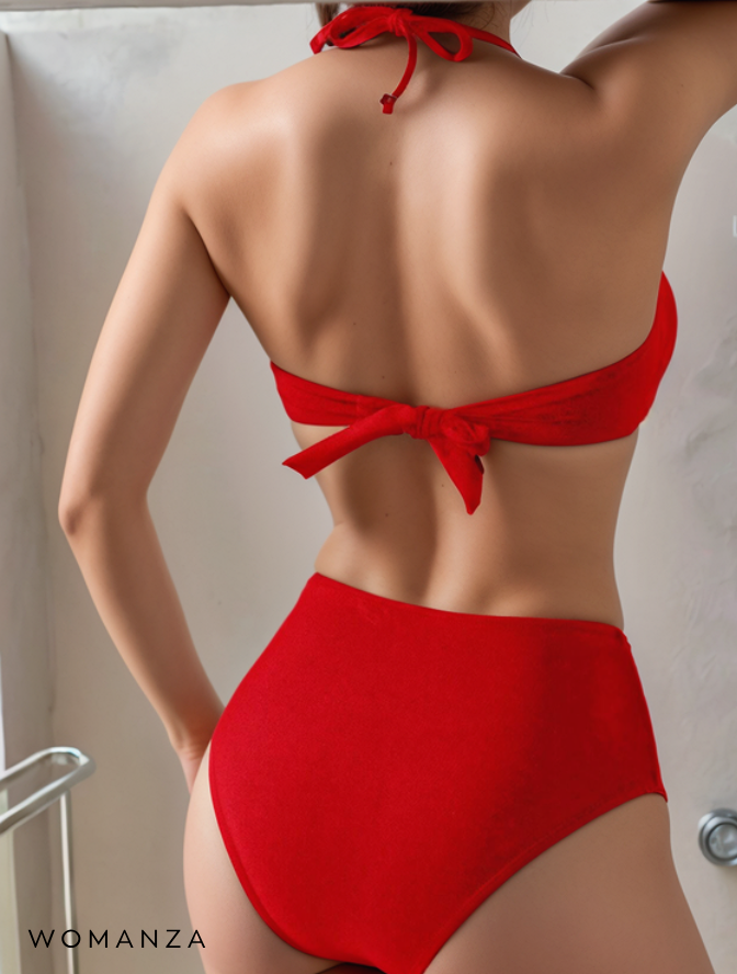 Swimwear Flame is gemaakt voor vrouwen die een statement durven maken. De opvallende rode kleur in combinatie met de abstracte goudkleurige accenten maakt deze bikini onweerstaanbaar en iconisch. De high waist slip flatteert je taille, terwijl het topje elegant lift en vorm geeft. Gedurfd, stijlvol en krachtig — net als jij.