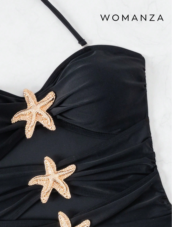 De Swimwear Siren Noir is de donkere, verleidelijke zus van de originele Siren. Met haar gouden zeesterren en dramatische cut-outs is ze gemaakt voor vrouwen die weten wat ze willen. Deze one-piece is gedurfd, stijlvol en onweerstaanbaar — of je nu flaneert op een jacht of geniet van een sunset swim.
