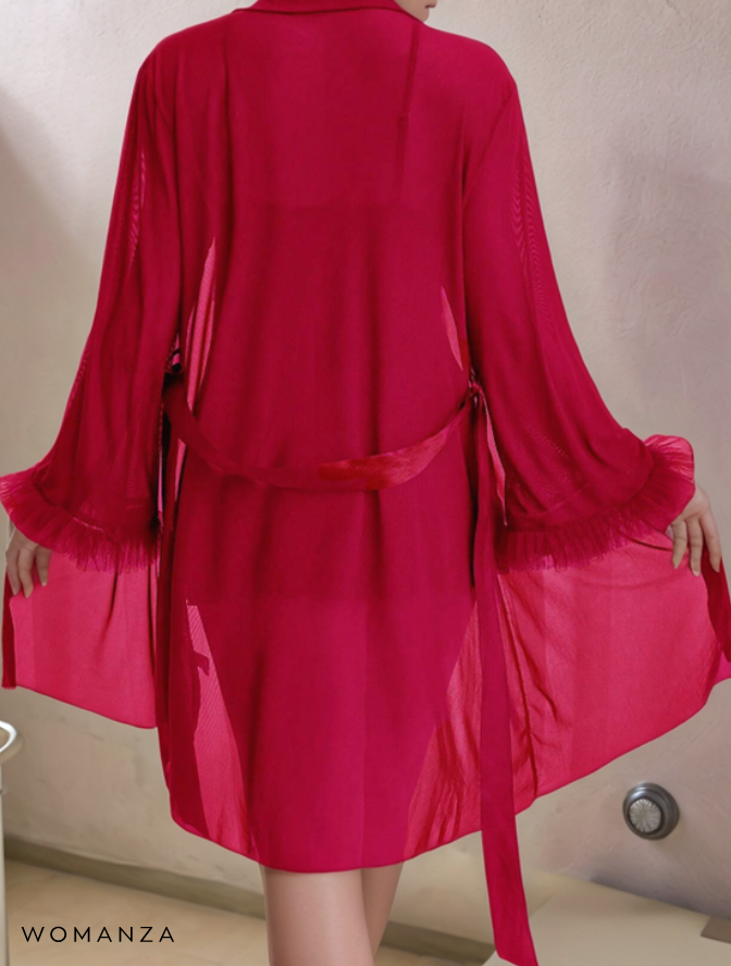 Wild Rouge Allure is een luxueuze combinatie van een kanten babydoll-jurk en een transparante kimono. Het zachte kant, de satijnen details en de speelse ruches maken deze set onweerstaanbaar. Een ode aan passie, kracht en vrouwelijkheid – voor de vrouw die durft te stralen.